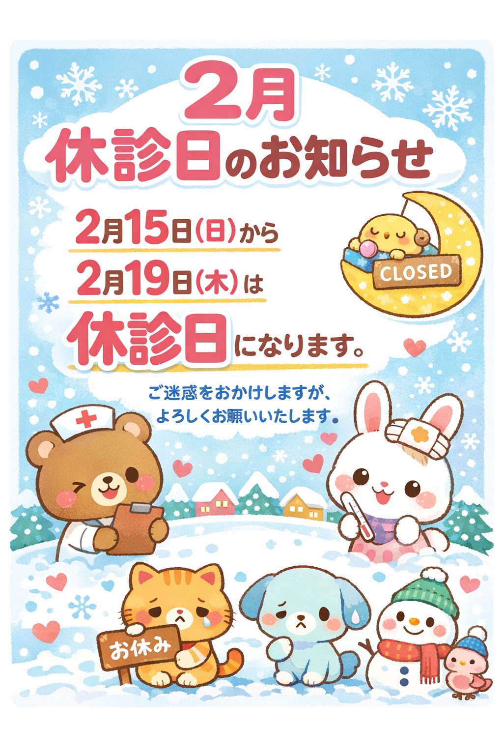【2月休診日のお知らせ】 2026.01.02 この記事のタイトルとURLをコピーする 2月15日(日)から2月19日(木)は休診日になります。 ご不便をおかけしますが、よろしくお願いいたします。 この記事のタイトルとURLをコピーする ✨当院のSNSも随時更新中です✨ 前の記事 【謹賀新年】 次の記事