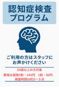 神経心理検査用プログラム ミレボ 始めました! 2025.10.05 この記事のタイトルとURLをコピーする 認知症の将来のリスクを調べてみませんか? 予防のためにも一度認知症の検査ミレボをお勧めします。 この記事のタイトルとURLをコピーする インフルエンザワクチンが10月1日から始まります。 前の記事